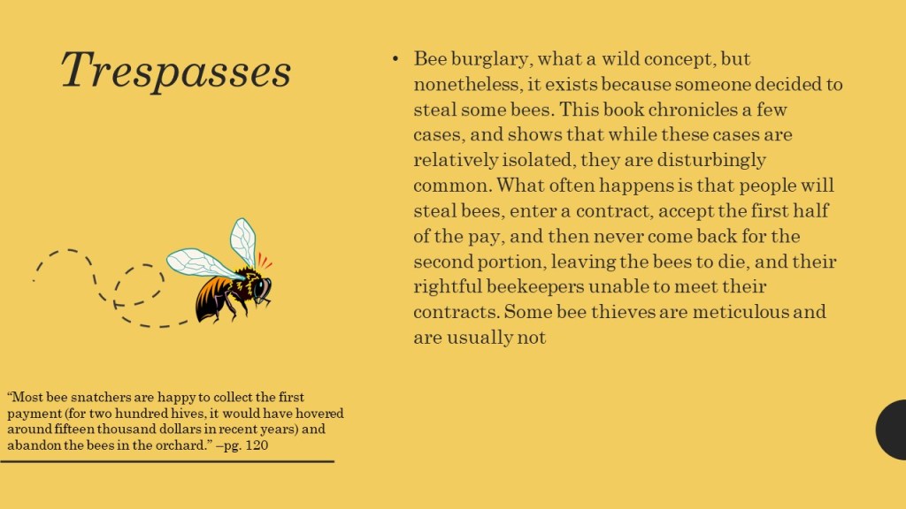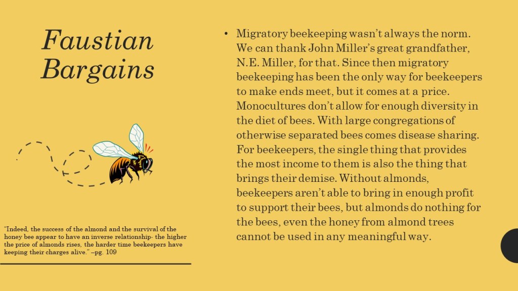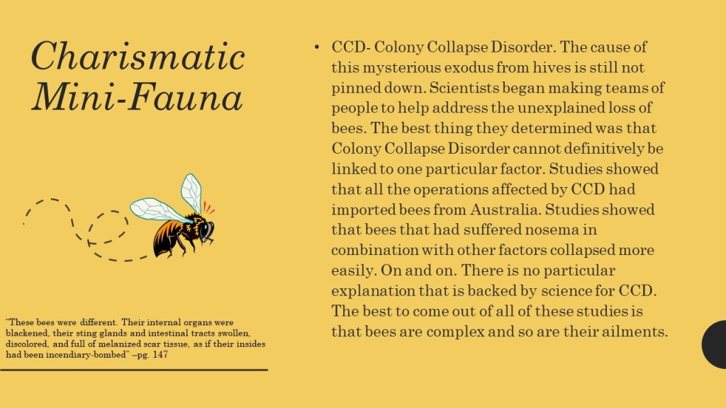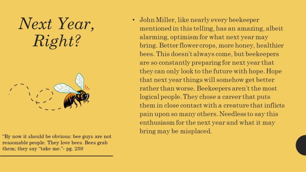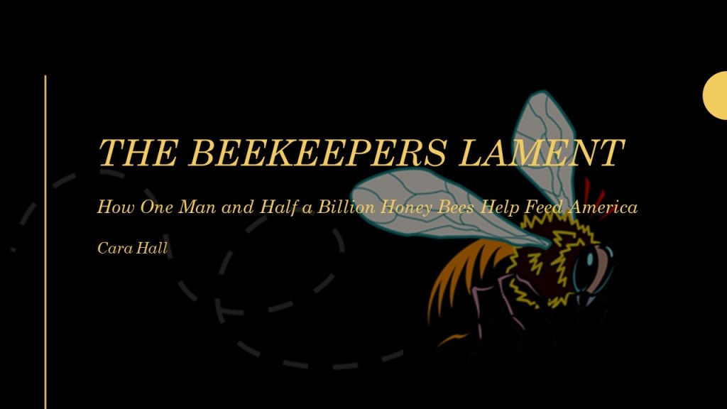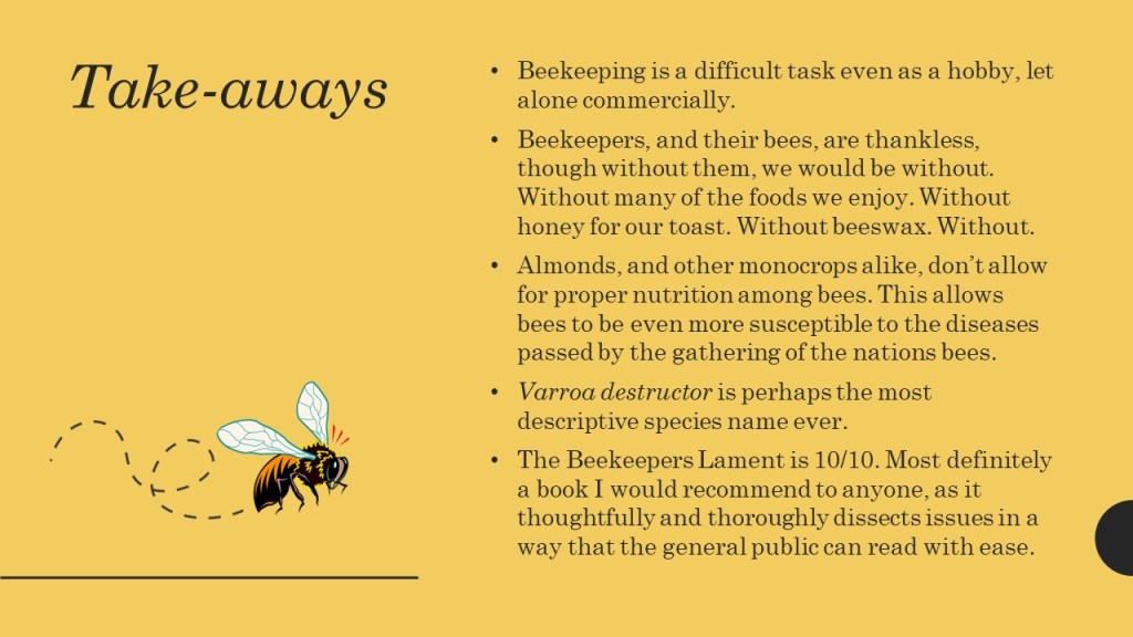 The Beekeepers Lament: How One Man and Half a Billion Bees Help Feed America. Sounds ominous right? To some degree, the book was definitely sad at times, funny at others, but it’s hard to be joyful when writing about all the factors coming together to cause the decline of bees in America. Hannah ___’s approach to this novel is something to behold, as she follows many different plot lines, different life events, of John Miller, a commercial beekeeper who is worth a book on his own. Add in the bees and you have a dynamite story that genuine beckons you to keep reading, chapter after chapter. I am attaching my slides from my presentation where you can find a chapter breakdown, but again, this is a great book.