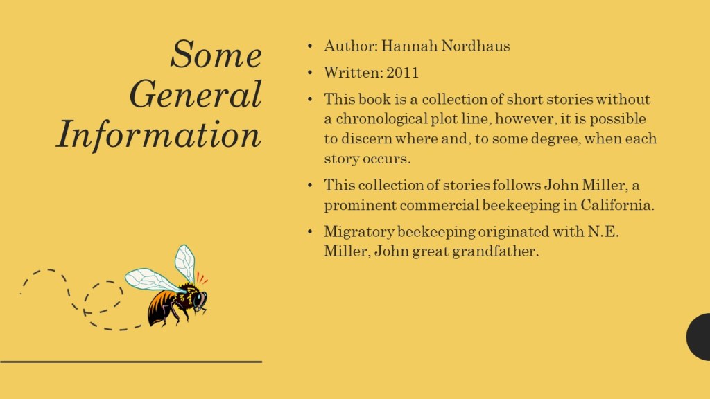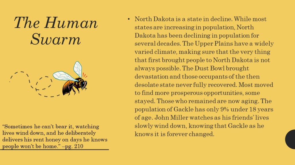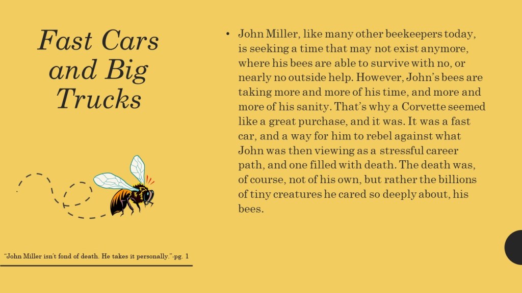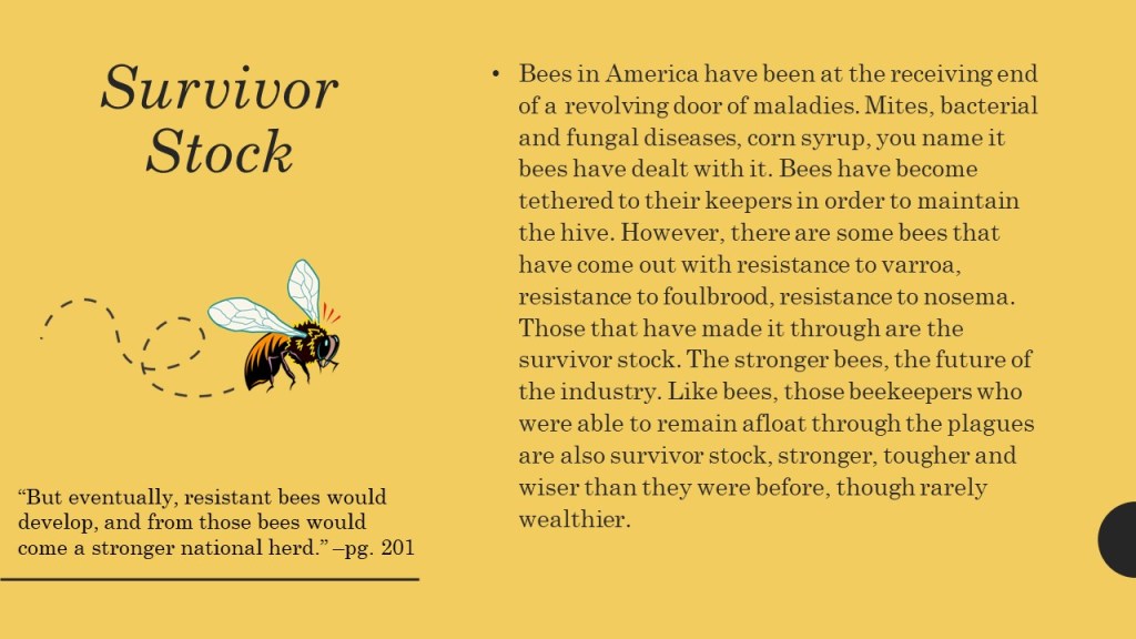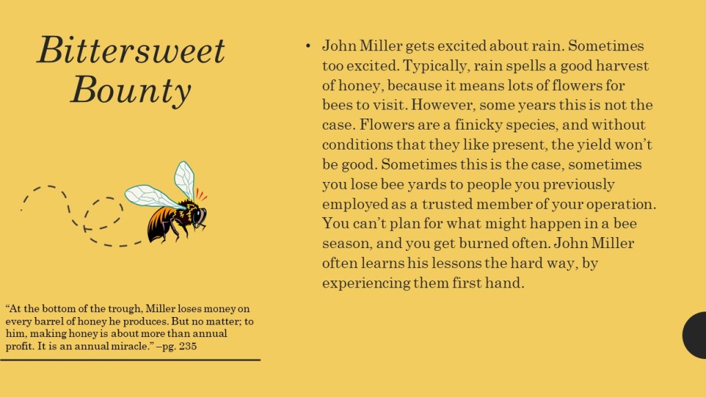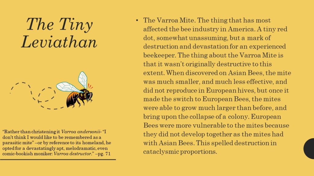The Beekeepers Lament: How One Man and Half a Billion Bees Help Feed America. Sounds ominous right? To some degree, the book was definitely sad at times, funny at others, but it’s hard to be joyful when writing about all the factors coming together to cause the decline of bees in America. Hannah ___’s approach to this novel is something to behold, as she follows many different plot lines, different life events, of John Miller, a commercial beekeeper who is worth a book on his own. Add in the bees and you have a dynamite story that genuine beckons you to keep reading, chapter after chapter. I am attaching my slides from my presentation where you can find a chapter breakdown, but again, this is a great book.